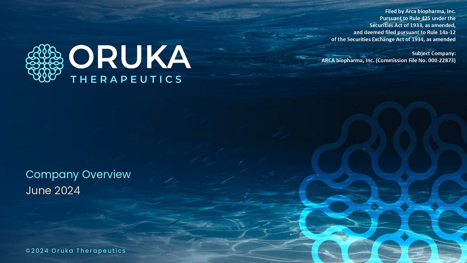 ©2024 Oruka Therapeutics 1 Company Overview June 2024 ©2024 Oruka Therapeutics Filed by Arca biopharma, Inc. Pursuant to Rule 425 under the Securities Act of 1933, as amended, and deemed filed pursuant to Rule 14a - 12 of the Securities Exchange Act of 1934, as amended Subject Company: ARCA biopharma, Inc. (Commission File No. 000 - 22873)