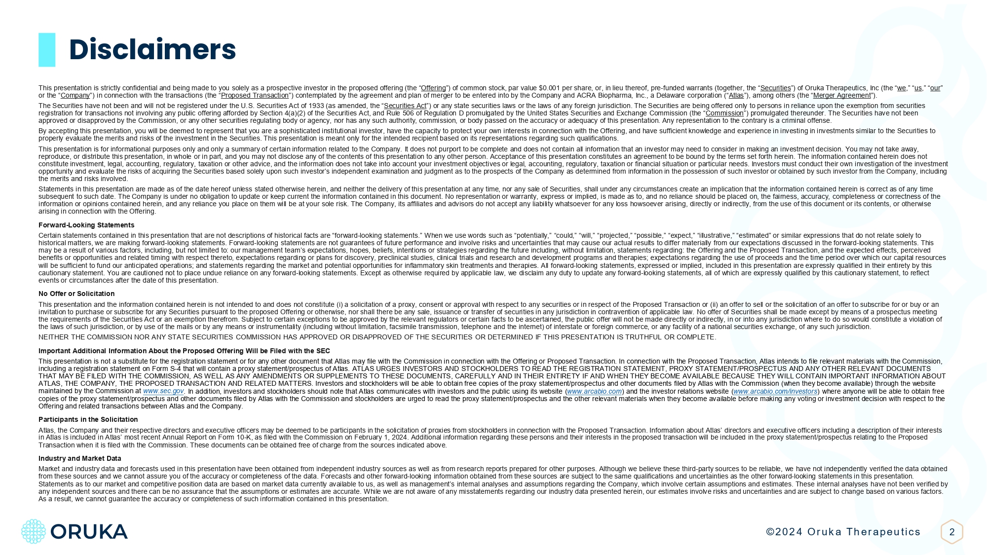 ©2024 Oruka Therapeutics 2 This presentation is strictly confidential and being made to you solely as a prospective investor in the proposed offering (t he “ Offering ”) of common stock, par value $0.001 per share, or, in lieu thereof, pre - funded warrants (together, the “ Securities ”) of Oruka Therapeutics, Inc (the “ we ,” “ us ,” “ our ” or the “ Company ”) in connection with the transactions (the “ Proposed Transaction ”) contemplated by the agreement and plan of merger to be entered into by the Company and ACRA Biopharma, Inc., a Delaware corporation (“ Atlas ”), among others (the “ Merger Agreement ”). The Securities have not been and will not be registered under the U.S. Securities Act of 1933 (as amended, the “ Securities Act ”) or any state securities laws or the laws of any foreign jurisdiction. The Securities are being offered only to persons in reliance upon the exemption from securities registration for transactions not involving any public offering afford ed by Section 4(a)(2) of the Securities Act, and Rule 506 of Regulation D promulgated by the United States Securities and Exchange Commission (the “ Commission ”) promulgated thereunder. The Securities have not been approved or disapproved by the Commission, or any other securities re gul ating body or agency, nor has any such authority, commission, or body passed on the accuracy or adequacy of this presentation. Any representation to the contrary is a criminal offense. By accepting this presentation, you will be deemed to represent that you are a sophisticated institutional investor, have the ca pacity to protect your own interests in connection with the Offering, and have sufficient knowledge and experience in investing in investments similar to the Securities to properly evaluate the merits and risks of the investment in the Securities. This presentation is meant only for the intended recipient based on its representations regarding such qualifications. This presentation is for informational purposes only and only a summary of certain information related to the Company. It doe s n ot purport to be complete and does not contain all information that an investor may need to consider in making an investment decision. You may not take away, reproduce, or distribute this presentation, in whole or in part, and yo u m ay not disclose any of the contents of this presentation to any other person. Acceptance of this presentation constitutes an agreement to be bound by the terms set forth herein. The information contained herein does not co nst itute investment, legal, accounting, regulatory, taxation or other advice, and the information does not take into account your investment objectives or legal, accounting, regulatory, taxation or financial situation or particular nee ds. Investors must conduct their own investigation of the investment opportunity and evaluate the risks of acquiring the Securities based solely upon such investor’s independent examination and judgment as to the prospects of the Co mpa ny as determined from information in the possession of such investor or obtained by such investor from the Company, including the merits and risks involved. Statements in this presentation are made as of the date hereof unless stated otherwise herein, and neither the delivery of th is presentation at any time, nor any sale of Securities, shall under any circumstances create an implication that the information contained herein is correct as of any time subsequent to such date. The Company is under no obligation to upd ate or keep current the information contained in this document. No representation or warranty, express or implied, is made as to, and no reliance should be placed on, the fairness, accuracy, completeness or correctness of the infor mat ion or opinions contained herein, and any reliance you place on them will be at your sole risk. The Company, its affiliates and advisors do not accept any liability whatsoever for any loss howsoever arising, directly or indir ect ly, from the use of this document or its contents, or otherwise arising in connection with the Offering. Forward - Looking Statements Certain statements contained in this presentation that are not descriptions of historical facts are “forward - looking statements. ” When we use words such as “potentially,” “could,” “will,” “projected,” “possible,” “expect,” “illustrative,” “estimated” or similar expressions that do not relate solely to historical matters, we are making forward - looking statements. Fo rward - looking statements are not guarantees of future performance and involve risks and uncertainties that may cause our actual results to differ materially from our expectations discussed in the forward - looking statements. This may be a result of various factors, including, but not limited to: our management team’s expectations, hopes, beliefs, intentions or strategies regarding the future including, without limitation, statements regarding: the Offering and the Proposed Transaction, and the expected effects, perceived benefits or opportunities and related timing with respect thereto, expectations regarding or plans for discovery, preclinical studies, clinical trials and research and develop men t programs and therapies; expectations regarding the use of proceeds and the time period over which our capital resources will be sufficient to fund our anticipated operations; and statements regarding the market and potential op por tunities for inflammatory skin treatments and therapies. All forward - looking statements, expressed or implied, included in this presentation are expressly qualified in their entirety by this cautionary statement. You are cautio ned not to place undue reliance on any forward - looking statements. Except as otherwise required by applicable law, we disclaim any duty to update any forward - looking statements, all of which are expressly qualified by this 