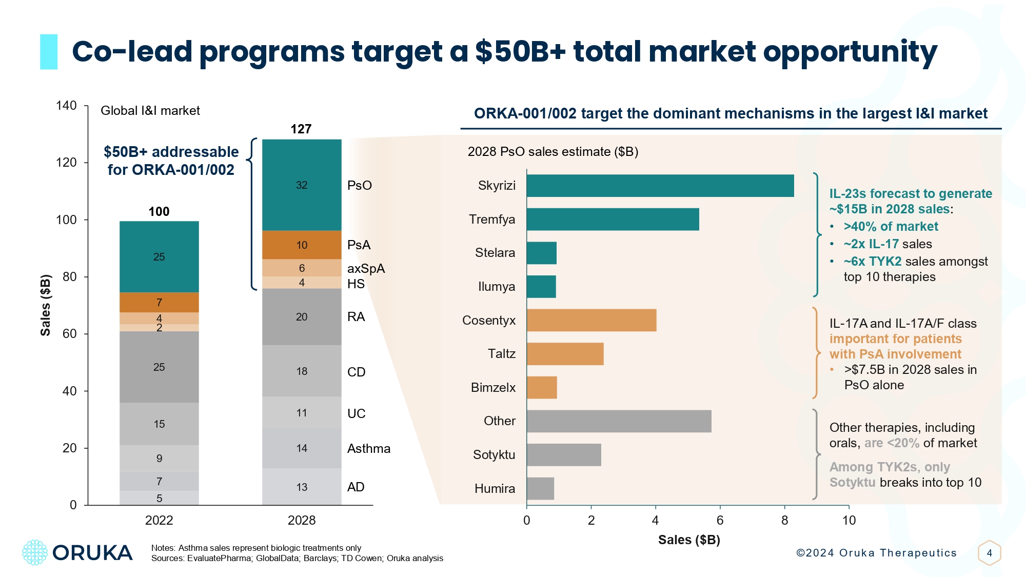 ©2024 Oruka Therapeutics 5 5 13 7 14 9 11 15 18 25 20 2 4 4 6 7 10 25 32 0 20 40 60 80 100 120 140 2022 2028 Sales ($B) 0 2 4 6 8 10 Humira Sotyktu Other Bimzelx Taltz Cosentyx Ilumya Stelara Tremfya Skyrizi Co - lead programs target a $50B+ total market opportunity ORKA - 001/002 target the dominant mechanisms in the largest I&I market 2028 PsO sales estimate ($B) Global I&I market 100 127 IL - 23s forecast to generate ~$15B in 2028 sales : • >40% of market • ~2x IL - 17 sales • ~6x TYK2 sales amongst top 10 therapies IL - 17A and IL - 17A/F class important for patients with PsA involvement • >$7.5 B in 2028 sales in PsO alone Among TYK2s , only Sotyktu breaks into top 10 Other therapies, including orals, are < 20% of market Notes: Asthma sales represent biologic treatments only Sources: EvaluatePharma; GlobalData; Barclays; TD Cowen; Oruka analysis $50B+ addressable for ORKA - 001/002 HS RA CD UC Asthma AD PsO PsA axSpA Sales ($B)