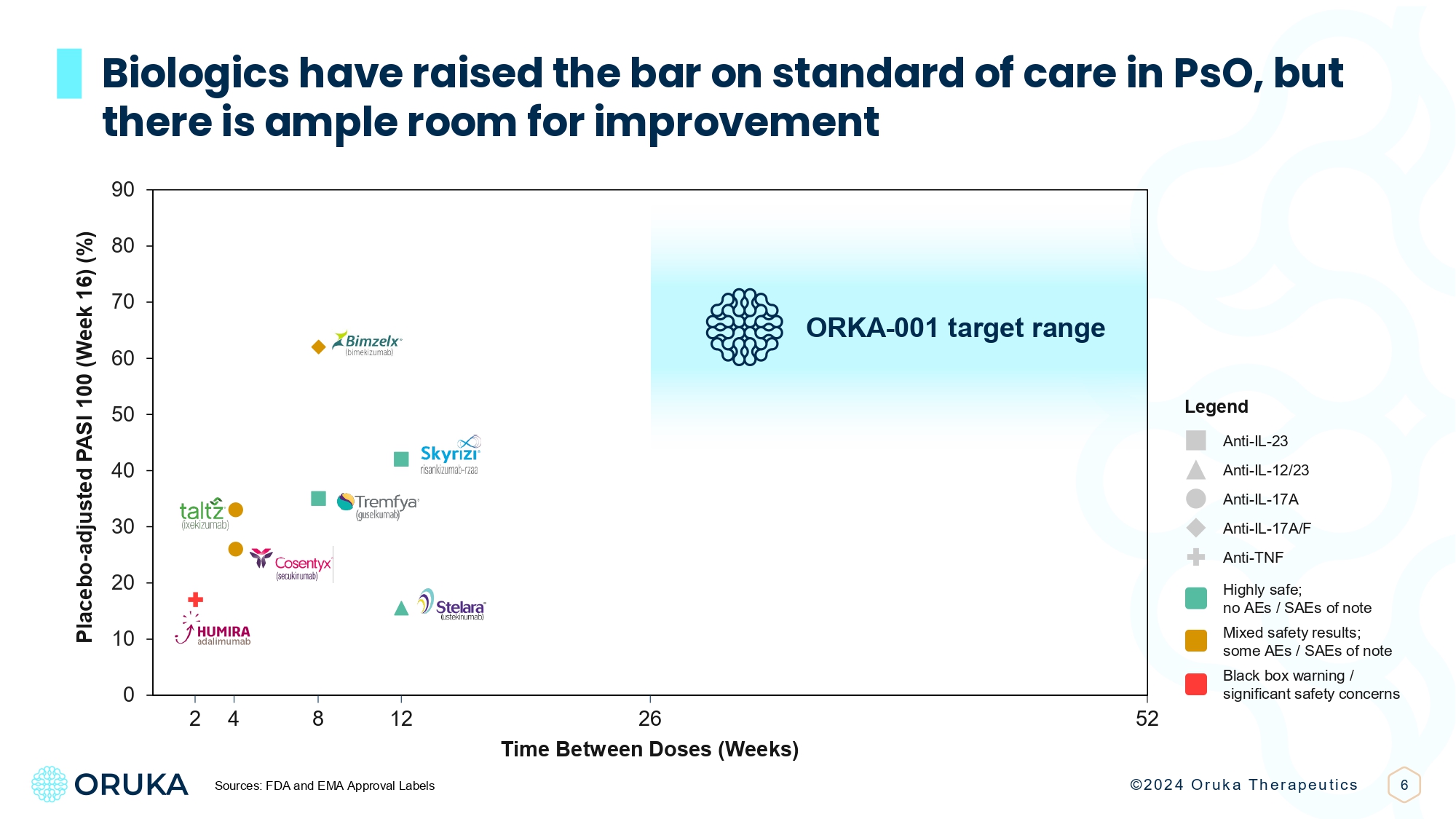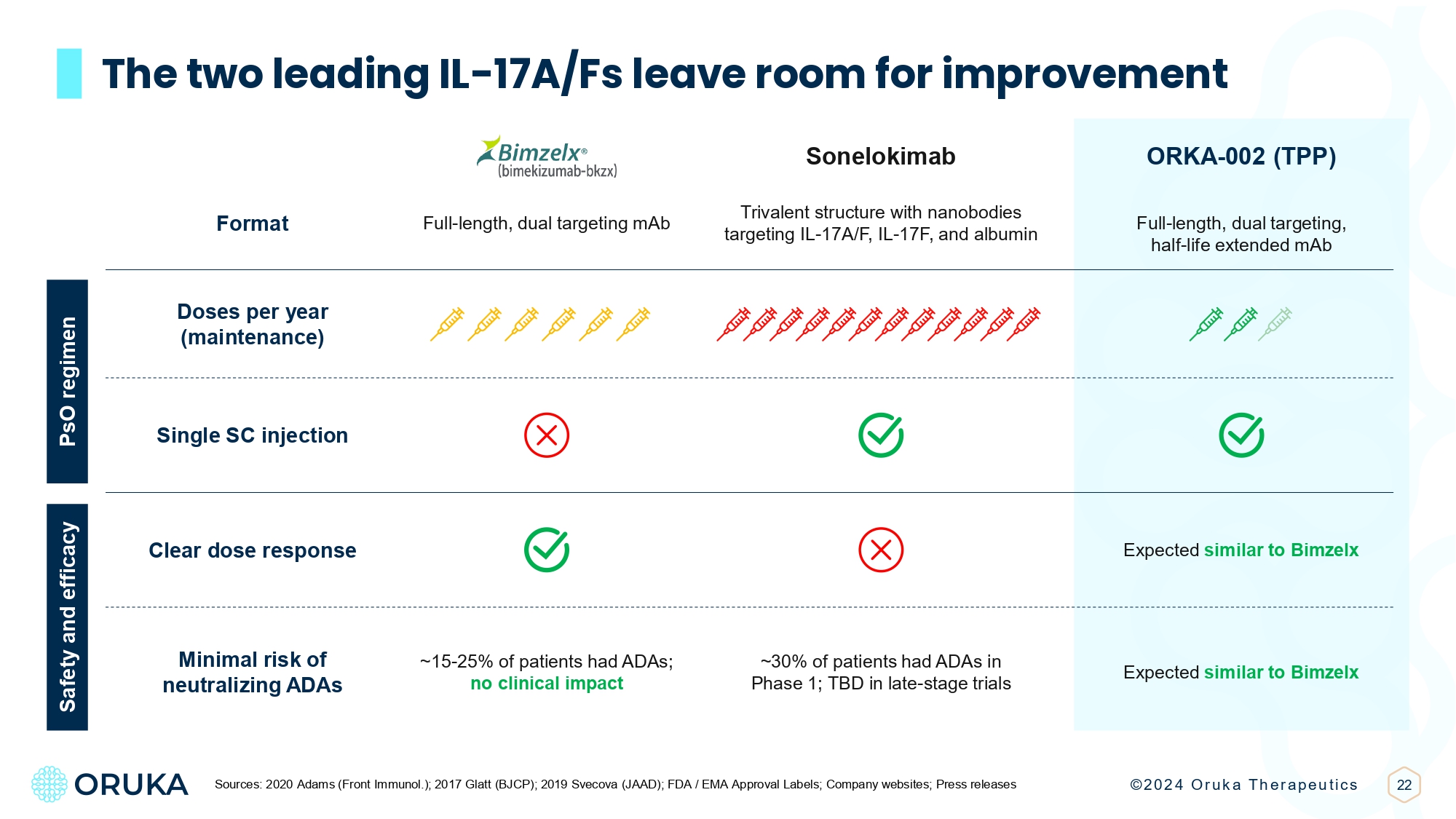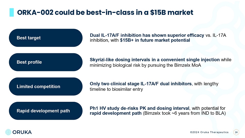 ©2024 Oruka Therapeutics 23 The two leading IL - 17A/Fs leave room for improvement Sources: 2020 Adams (Front Immunol.); 2017 Glatt (BJCP); 2019 Svecova (JAAD); FDA / EMA Approval Labels; Company websites; Pr ess releases ORKA - 002 (TPP) Sonelokimab Format Full - length, dual targeting, half - life extended mAb Trivalent structure with nanobodies targeting IL - 17A/F, IL - 17F, and albumin Full - length, dual targeting mAb Clear dose response Expected similar to Bimzelx Minimal risk of neutralizing ADAs Expected similar to Bimzelx ~30% of patients had ADAs in Phase 1; TBD in late - stage trials ~15 - 25% of patients had ADAs; no clinical impact Single SC injection Safety and efficacy PsO regimen Doses per year (maintenance)