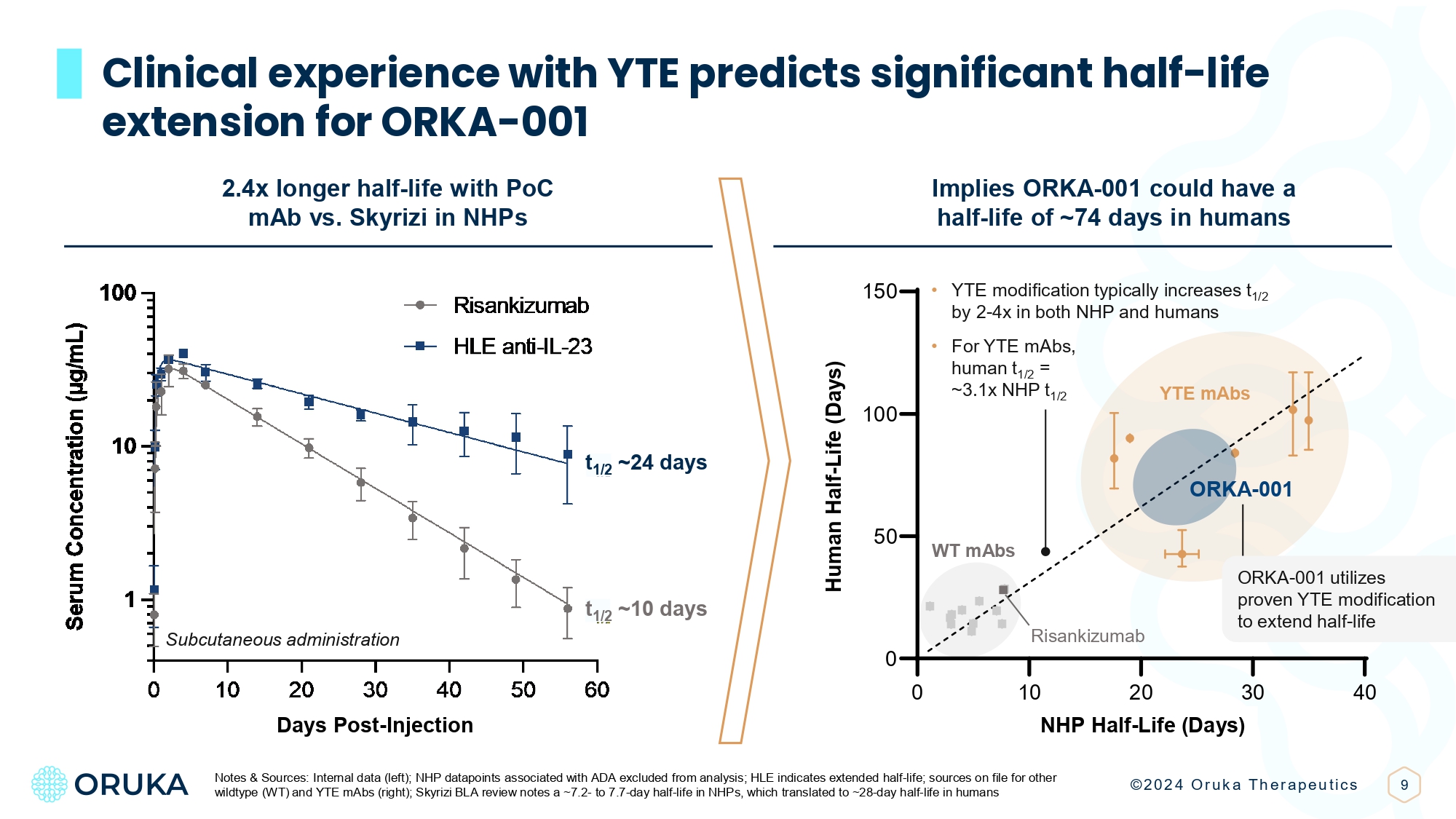 ©2024 Oruka Therapeutics 10 0 10 20 30 40 0 50 100 150 Cyno Half-Life (Days) H u m a n H a l f - L i f e ( D a y s ) Clinical experience with YTE predicts significant half - life extension for ORKA - 001 Notes & Sources: Internal data (left); NHP datapoints associated with ADA excluded from analysis; HLE indicates extended half - life; sources on file for other wildtype ( WT) and YTE mAbs (right); Skyrizi BLA review notes a ~7.2 - to 7.7 - day half - life in NHPs , which translated to ~28 - day half - life in humans 2.4x longer half - life with PoC mAb vs. Skyrizi in NHPs 0 10 20 30 40 50 60 1 10 100 Days Post-Injection S e r u m C o n c e n t r a t i o n ( µ g / m L ) Risankizumab HLE anti-IL-23 t 1/2 ~24 days t 1/2 ~10 days t 1/2 ~24 days t 1/2 ~10 days Implies ORKA - 001 could have a half - life of ~74 days in humans Subcutaneous administration NHP Half - Life (Days) Days Post - Injection Human Half - Life (Days) WT mAbs YTE mAbs Risankizumab • YTE modification typically increases t 1/2 by 2 - 4x in both NHP and humans ORKA - 001 utilizes proven YTE modification to extend half - life • For YTE mAbs, human t 1 /2 = ~ 3.1x NHP t 1 /2 ORKA - 001