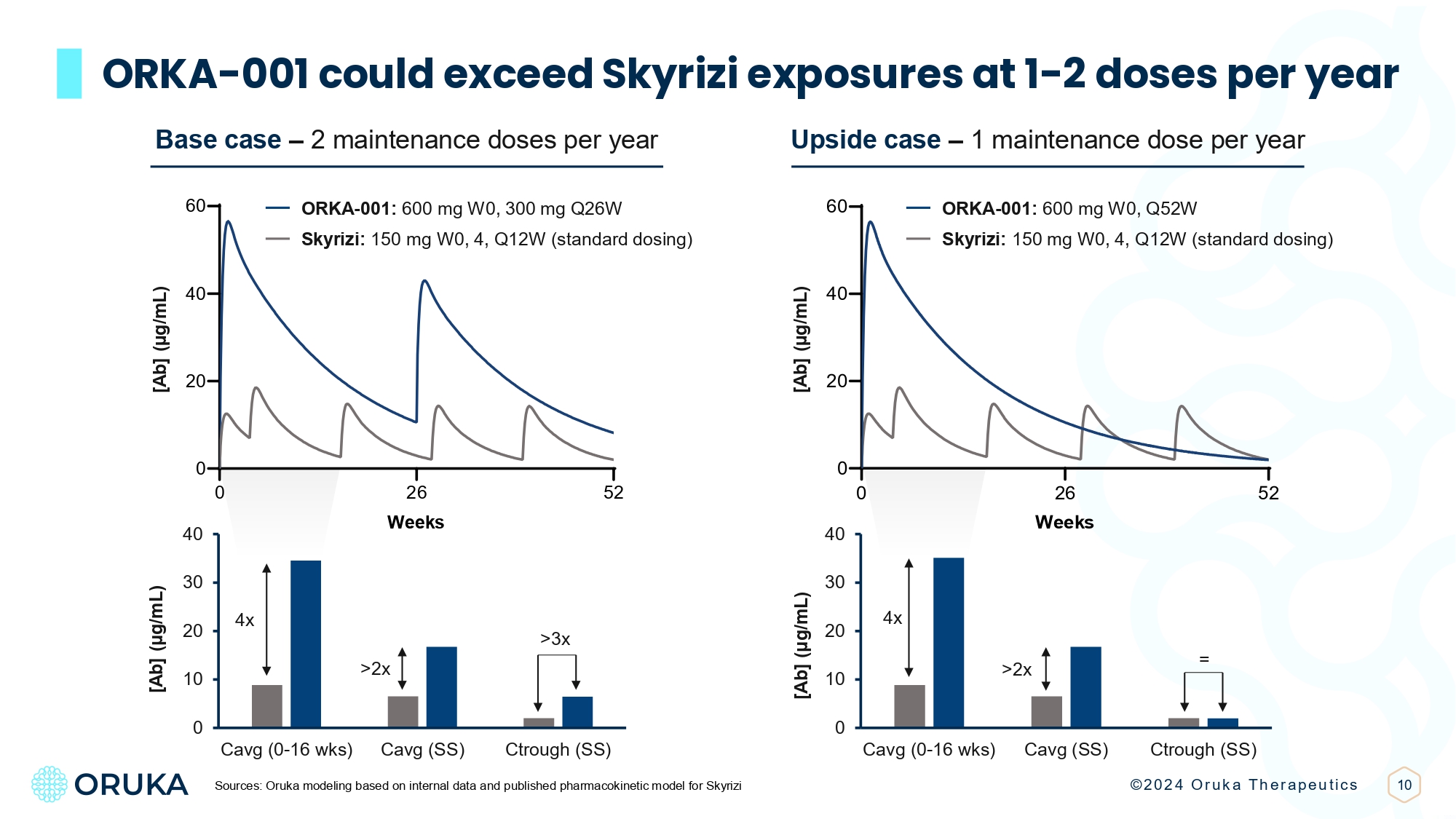 ©2024 Oruka Therapeutics 9 ORKA - 001 could be the last word in IL - 23p19 inhibitors Similar epitope to Skyrizi ( risankizumab ) with equal or better potency • Validated mechanism of action • Binds specifically to IL - 23p19 (not IL - 12/23 p40) • K D < 20 pM • Predicted equivalent safety • Predicted to meet or beat efficacy Novel IP for composition of matter into 2040s Effector - null human IgG1 Fc Half - life extension through validated Fc modification • Higher exposure to increase efficacy • Longer exposure to reduce dosing frequency Notes: Oruka holds worldwide rights to all therapeutic indications outside of IBD