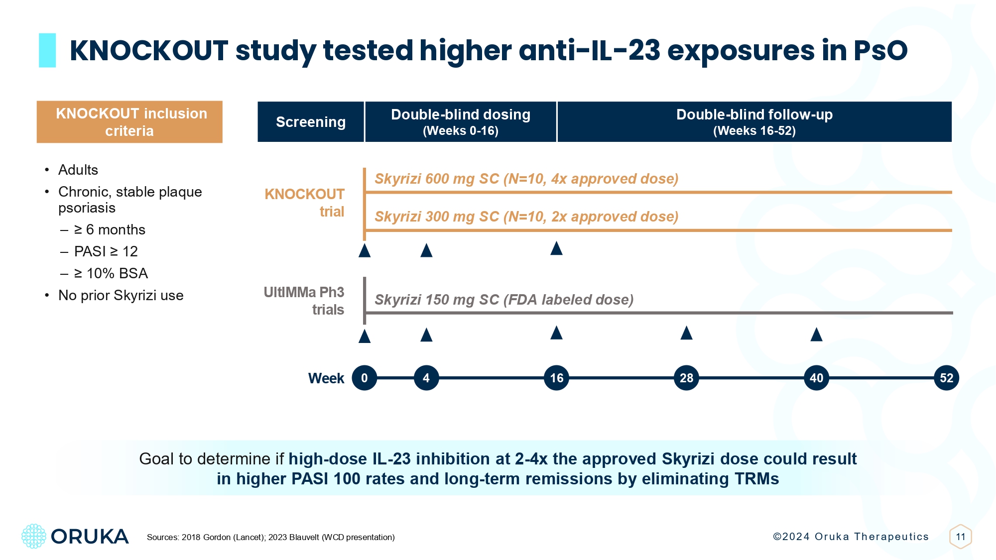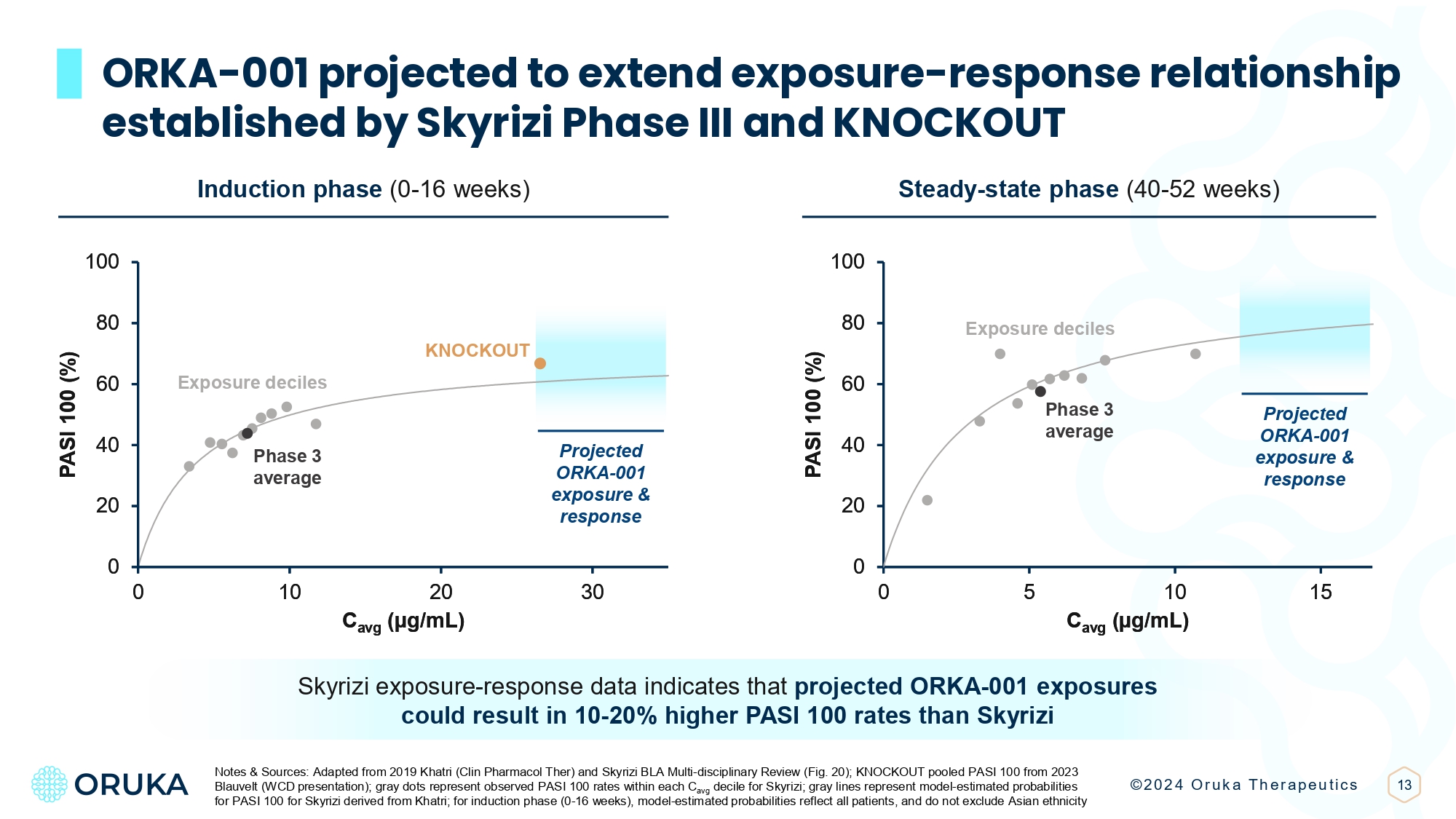 ©2024 Oruka Therapeutics 12 KNOCKOUT study tested higher anti - IL - 23 exposures in PsO Double - blind follow - up (Weeks 16 - 52) Double - blind dosing (Weeks 0 - 16) Screening KNOCKOUT inclusion criteria • Adults • Chronic, stable plaque psoriasis – ≥ 6 months – PASI ≥ 12 – ≥ 10% BSA • No prior Skyrizi use Skyrizi 600 mg SC (N=10, 4x approved dose) Skyrizi 300 mg SC (N=10, 2x approved dose) KNOCKOUT t rial UltIMMa Ph3 t rials Skyrizi 150 mg SC (FDA labeled dose) Week 4 0 16 28 40 52 Goal to determine if high - dose IL - 23 inhibition at 2 - 4x the approved Skyrizi dose could result in higher PASI 100 rates and long - term remissions by eliminating TRMs Sources: 2018 Gordon (Lancet); 2023 Blauvelt (WCD presentation)
