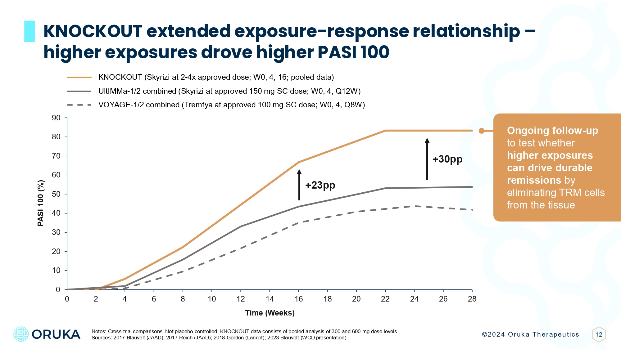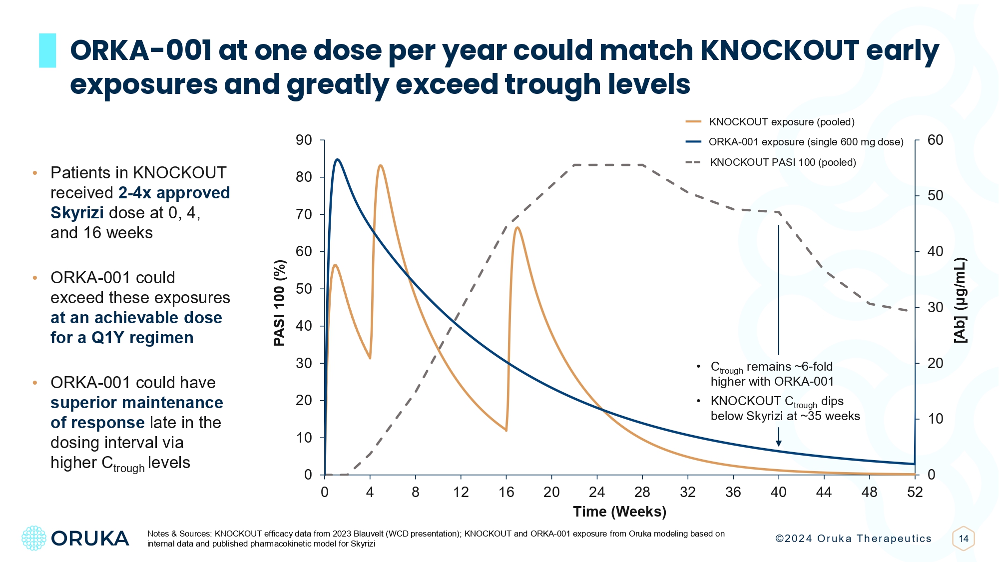 ©2024 Oruka Therapeutics 13 KNOCKOUT extended exposure - response relationship – higher exposures drove higher PASI 100 0 10 20 30 40 50 60 70 80 90 0 2 4 6 8 10 12 14 16 18 20 22 24 26 28 Time (Weeks) PASI 100 (%) UltIMMa - 1/2 combined (Skyrizi at approved 150 mg SC dose; W0 , 4, Q12W ) VOYAGE - 1/2 combined (Tremfya at approved 100 mg SC dose; W0, 4, Q8W) Notes: Cross - trial comparisons. Not placebo controlled. KNOCKOUT data consists of pooled analysis of 300 and 600 mg dose levels Sources: 2017 Blauvelt (JAAD); 2017 Reich (JAAD); 2018 Gordon (Lancet); 2023 Blauvelt (WCD presentation) Ongoing follow - up to test whether higher exposures can drive durable remissions by eliminating TRM cells from the tissue +30pp +23pp KNOCKOUT (Skyrizi at 2 - 4x approved dose; W0 , 4, 16; pooled data)
