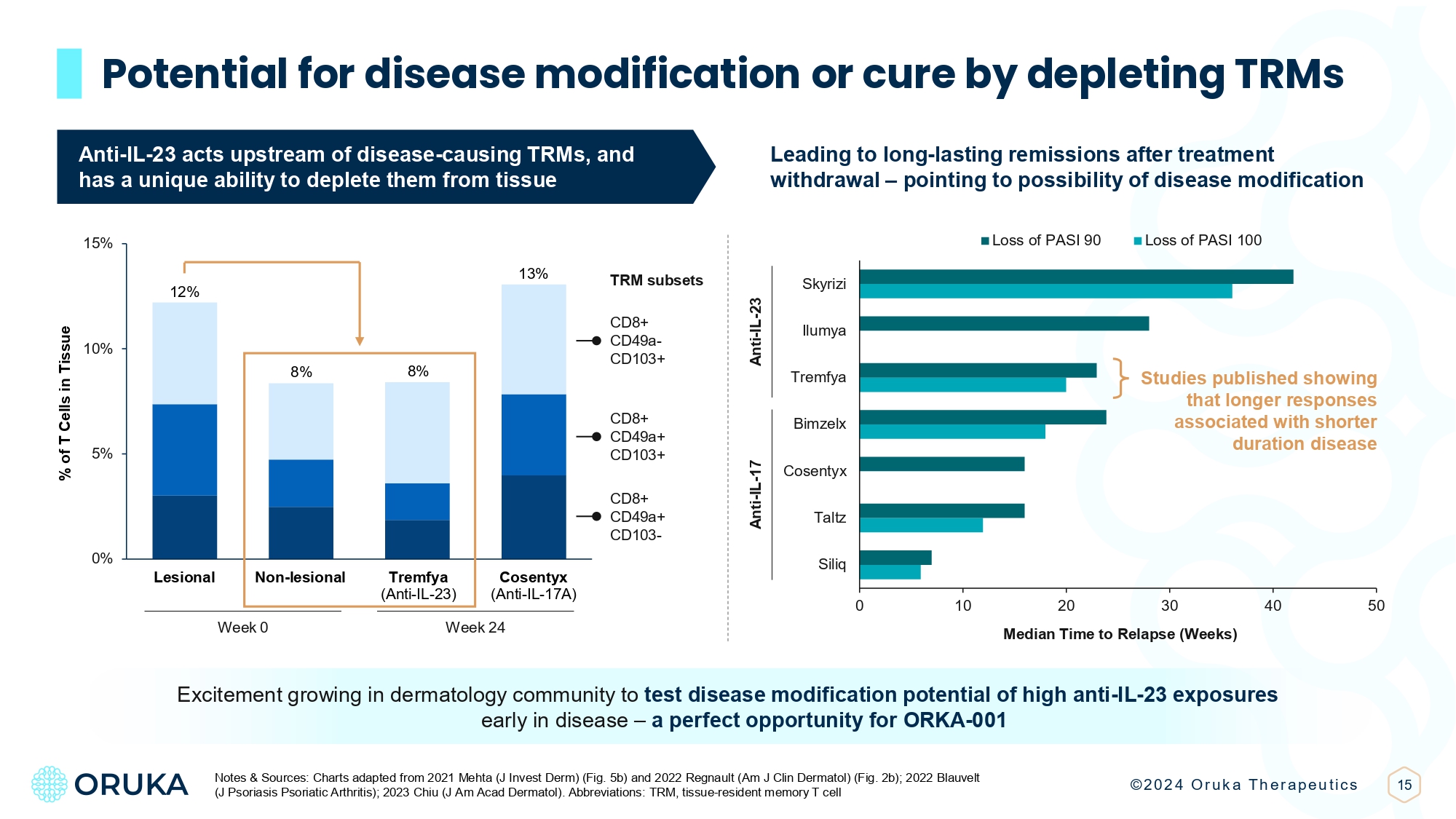 ©2024 Oruka Therapeutics 14 0 20 40 60 80 100 0 10 20 30 PASI 100 (%) C avg (µg/mL) 0 20 40 60 80 100 0 10 20 30 PASI 100 (%) C avg (µg/mL) KNOCKOUT Notes & Sources: Adapted from 2019 Khatri (Clin Pharmacol Ther ) and Skyrizi BLA Multi - disciplinary Review (Fig. 20); KNOCKOUT pooled PASI 100 from 2023 Blauvelt (WCD presentation); gray dots represent observed PASI 100 rates within each C avg decile for Skyrizi ; g ray lines represent model - estimated probabilities for PASI 100 for Skyrizi derived from Khatri ; f or induction phase (0 - 16 weeks), model - estimated probabilities reflect all patients, and do not exclude Asian ethnicity ORKA - 001 projected to extend exposure - response relationship established by Skyrizi Phase III and KNOCKOUT Induction phase (0 - 16 weeks) Steady - state phase (40 - 52 weeks) Skyrizi exposure - response data indicates that projected ORKA - 001 exposures could result in 10 - 20% higher PASI 100 rates than Skyrizi Exposure deciles Phase 3 average Projected ORKA - 001 exposure & response 0 20 40 60 80 100 0 5 10 15 PASI 100 (%) C avg (µg/mL) Phase 3 average Projected ORKA - 001 exposure & response Exposure deciles 0 20 40 60 80 100 0 5 10 15 PASI 100 (%) C avg (µg/mL)