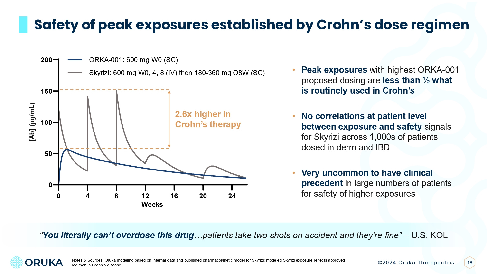 ©2024 Oruka Therapeutics 15 ORKA - 001 at one dose per year could match KNOCKOUT early exposures and greatly exceed trough levels Notes & Sources: KNOCKOUT efficacy data from 2023 Blauvelt (WCD presentation); KNOCKOUT and ORKA - 001 exposure from Oruka modeling based on internal data and published pharmacokinetic model for Skyrizi 0 10 20 30 40 50 60 0 10 20 30 40 50 60 70 80 90 0 4 8 12 16 20 24 28 32 36 40 44 48 52 [Ab] ( μ g/mL) PASI 100 (%) Time (Weeks) • Patients in KNOCKOUT received 2 - 4x approved Skyrizi dose at 0, 4, and 16 weeks • ORKA - 001 could exceed these exposures at an achievable dose for a Q1Y regimen • ORKA - 001 could have superior maintenance of response late in the dosing interval via higher C trough levels • C trough remains ~6 - fold higher with ORKA - 001 • KNOCKOUT C trough dips below Skyrizi at ~35 weeks ORKA - 001 exposure (single 600 mg dose) KNOCKOUT exposure (pooled) KNOCKOUT PASI 100 (pooled)