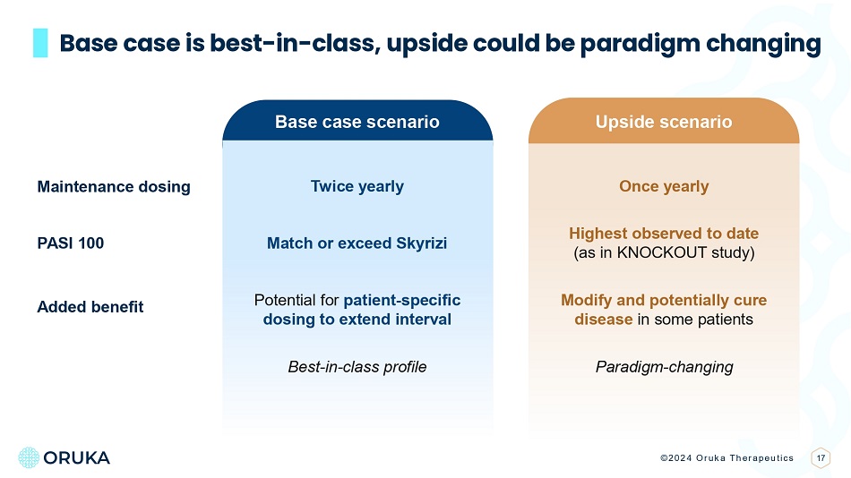 ©2024 Oruka Therapeutics 16 0 10 20 30 40 50 Siliq Taltz Cosentyx Bimzelx Tremfya Ilumya Skyrizi Loss of PASI 90 Loss of PASI 100 Potential for disease modification or cure by depleting TRMs 0% 5% 10% 15% % of T Cells in Tissue 12% 8% 8% 13% Leading to long - lasting remissions after treatment withdrawal – pointing to possibility of disease modification Anti - IL - 23 acts upstream of disease - causing TRMs, and has a unique ability to deplete them from tissue Excitement growing in dermatology community to test disease modification potential of high anti - IL - 23 exposures early in disease – a perfect opportunity for ORKA - 001 Studies published showing that longer responses associated with shorter duration disease Lesional Non - lesional Tremfya (Anti - IL - 23) Cosentyx (Anti - IL - 17A) Notes & Sources: Charts adapted from 2021 Mehta (J Invest Derm) (Fig. 5b ) and 2022 Regnault (Am J Clin Dermatol) (Fig. 2b ); 2022 Blauvelt (J Psoriasis Psoriatic Arthritis); 2023 Chiu (J Am Acad Dermatol). Abbreviations: TRM, tissue - resident memory T cell Anti - IL - 23 Anti - IL - 17 TRM subsets CD8+ CD49a - CD103+ CD8+ CD49a+ CD103+ CD8+ CD49a+ CD103 - Week 0 Week 24 Median Time to Relapse (Weeks)