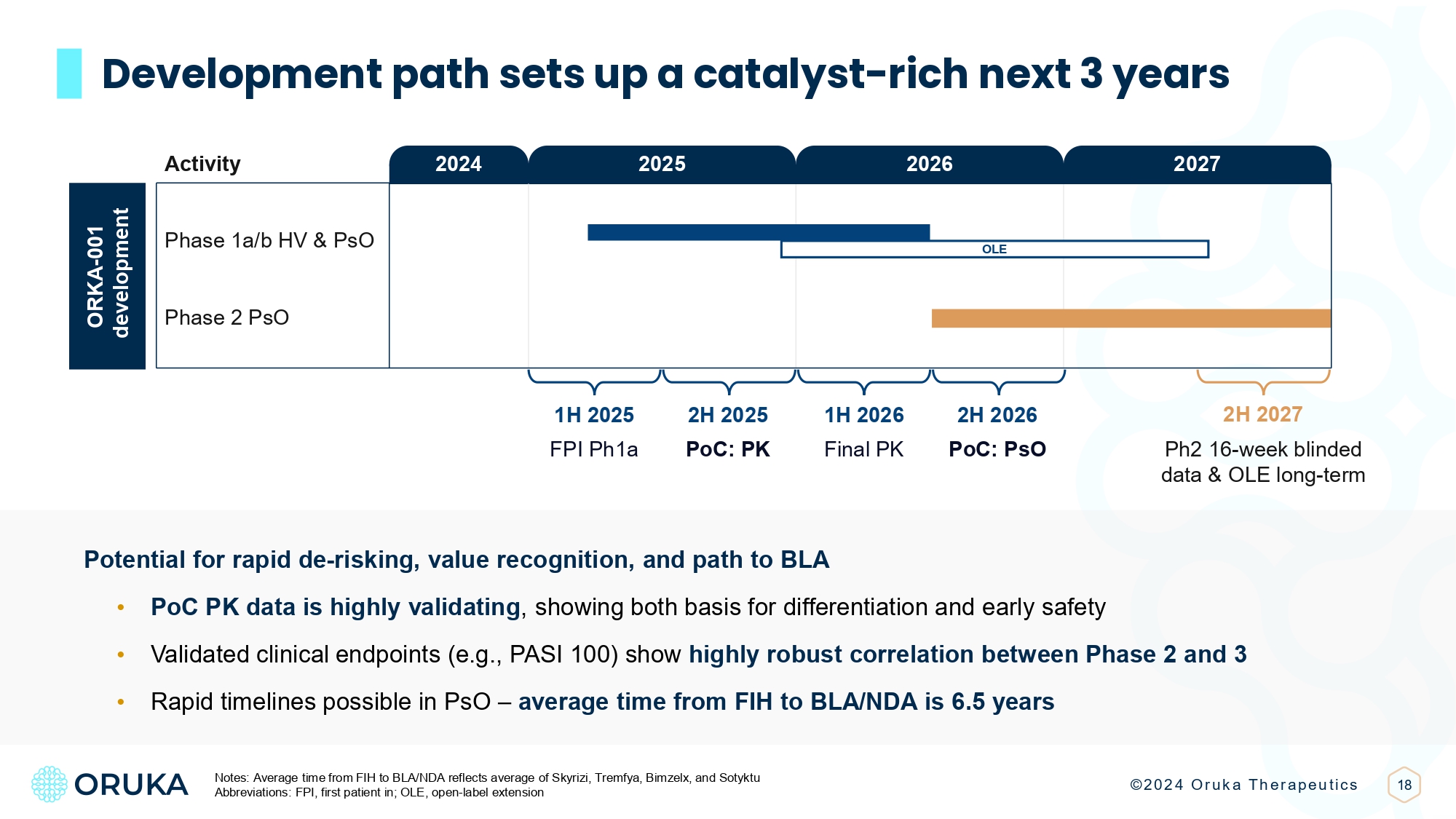 ©2024 Oruka Therapeutics 17 Safety of peak exposures established by Crohn’s dose regimen “ You literally can’t overdose this drug …patients take two shots on accident and they’re fine” – U.S. KOL Notes & Sources: Oruka modeling based on internal data and published pharmacokinetic model for Skyrizi; modeled Skyrizi exposure reflects approved regimen in Crohn’s disease 0 4 8 12 16 20 24 0 50 100 150 200 Weeks [ A b ] g / m L ORKA-001: 600 mg W0 (SC) Skyrizi: 600 mg W0, 4, 8 (IV) then 180-360 mg Q8W (SC) • Peak exposures with highest ORKA - 001 proposed dosing are less than ½ what is routinely used in Crohn’s • No correlations at patient level between exposure and safety signals for Skyrizi across 1,000s of patients dosed in derm and IBD • Very uncommon to have clinical precedent in large numbers of patients for safety of higher exposures 2.6x higher in Crohn’s therapy [Ab] (µg/mL)