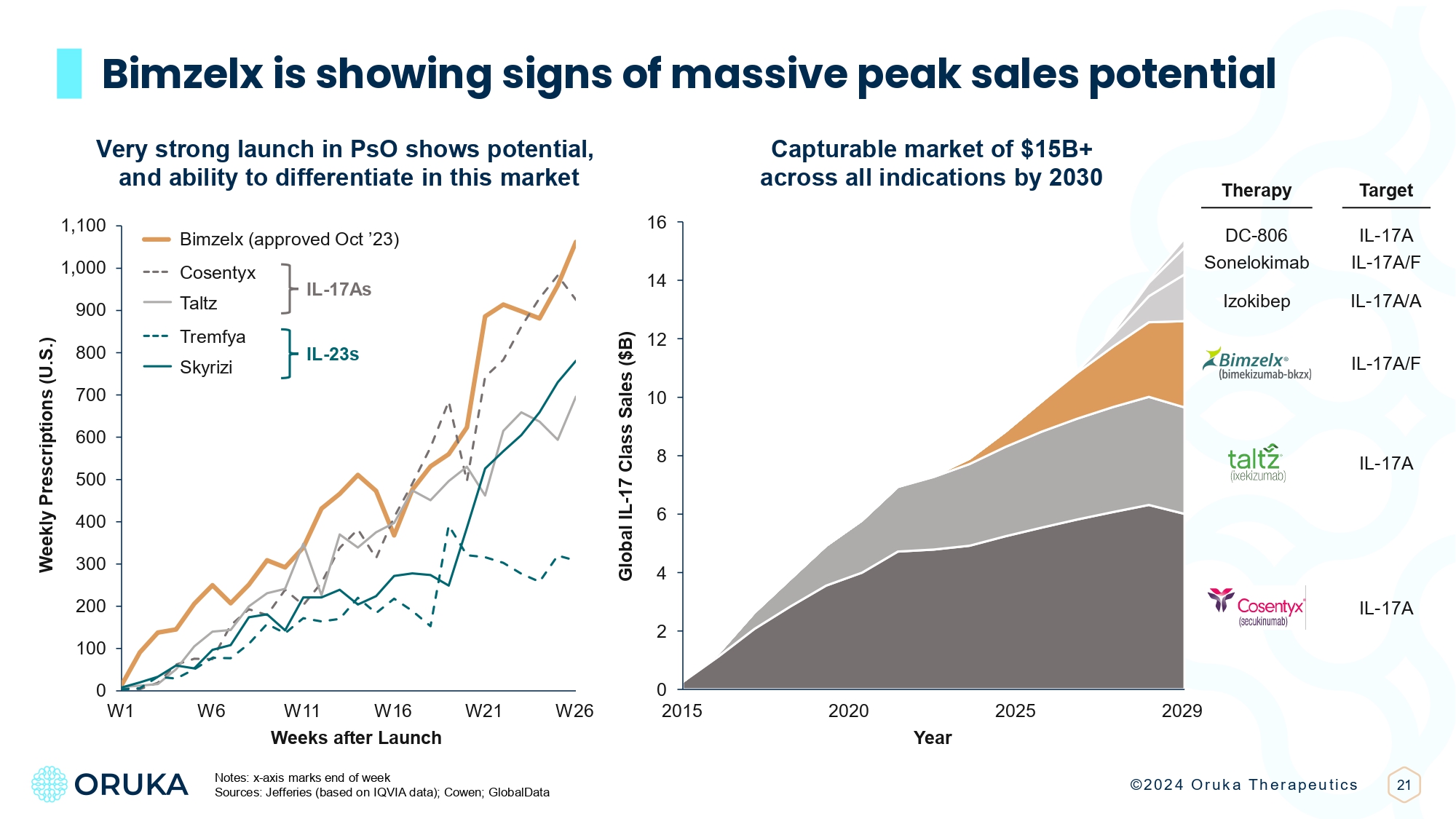 ©2024 Oruka Therapeutics 22 Bimzelx is showing signs of massive peak sales potential Notes: x - axis marks end of week Sources: Jefferies (based on IQVIA data); Cowen; GlobalData 0 100 200 300 400 500 600 700 800 900 1,000 1,100 Weekly Prescriptions (U.S.) Weeks after Launch W1 W6 W11 W26 Bimzelx (approved Oct ’23) Cosentyx Taltz Tremfya Skyrizi IL - 23s IL - 17As 2 4 6 8 10 12 14 16 0 Global IL - 17 Class Sales ($B) 2015 2020 Therapy Target DC - 806 Sonelokimab Izokibep IL - 17A IL - 17A/F IL - 17A/A IL - 17A/F IL - 17A IL - 17A 2025 2029 Very strong launch in PsO shows potential, and ability to differentiate in this market Capturable market of $15B+ across all indications by 2030 Year W16 W2 1