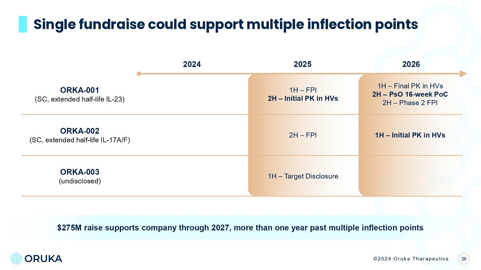 ©2024 Oruka Therapeutics 25 ORKA - 002 could be best - in - class in a $15B market Best target Dual IL - 17A/F inhibition has shown superior efficacy vs. IL - 17A inhibition, with $15B+ in future market potential Best profile Limited competition Skyrizi - like dosing intervals in a convenient single injection while minimizing biological risk by pursuing the Bimzelx MoA Rapid development path Ph1 HV study d e - risks PK and dosing interval , with potential for rapid development path (Bimzelx took ~6 years from IND to BLA) Only two clinical stage IL - 17A/F dual inhibitors , with lengthy timeline to biosimilar entry