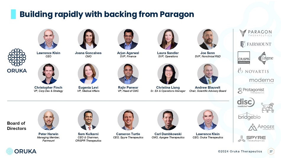 ©2024 Oruka Therapeutics 28 Building rapidly with backing from Paragon Peter Harwin Managing Member, Fairmount Lawrence Klein CEO Board of Directors Laura Sandler SVP, Operations Joana Goncalves CMO Arjun Agarwal SVP, Finance Christina Liang Sr. EA & Operations Manager Andrew Blauvelt Chair, Scientific Advisory Board Sam Kulkarni CEO & Chairman, CRISPR Therapeutics Cameron Turtle CEO, Spyre Therapeutics Carl Dambkowski CMO, Apogee Therapeutics Christopher Finch VP, Corp Dev & Strategy Lawrence Klein CEO, Oruka Therapeutics Eugenia Levi VP, Medical Affairs Joe Senn SVP, Nonclinical R&D Rajiv Panwar VP , Head of CMC