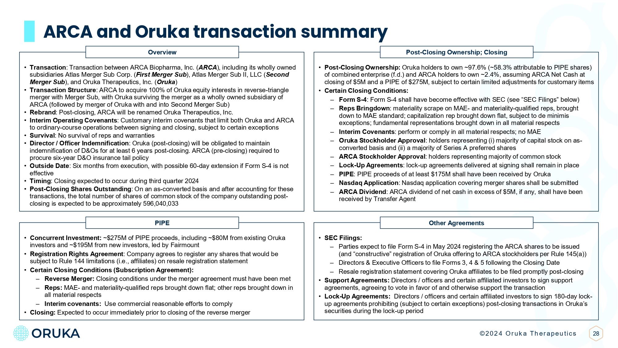 ©2024 Oruka Therapeutics 29 ARCA and Oruka transaction summary • Transaction : Transaction between ARCA Biopharma, Inc. ( ARCA ), including its wholly owned subsidiaries Atlas Merger Sub Corp. ( First Merger Sub ), Atlas Merger Sub II, LLC ( Second Merger Sub ), and Oruka Therapeutics, Inc. ( Oruka ) • Transaction Structure : ARCA to acquire 100% of Oruka equity interests in reverse - triangle merger with Merger Sub, with Oruka surviving the merger as a wholly owned subsidiary of ARCA (followed by merger of Oruka with and into Second Merger Sub) • Rebrand : Post - closing, ARCA will be renamed Oruka Therapeutics, Inc. • Interim Operating Covenants : Customary interim covenants that limit both Oruka and ARCA to ordinary - course operations between signing and closing, subject to certain exceptions • Survival : No survival of reps and warranties • Director / Officer Indemnification : Oruka (post - closing) will be obligated to maintain indemnification of D&Os for at least 6 years post - closing. ARCA (pre - closing) required to procure six - year D&O insurance tail policy • Outside Date : Six months from execution, with possible 60 - day extension if Form S - 4 is not effective • Timing : Closing expected to occur during third quarter 2024 • Post - Closing Shares Outstanding : On an as - converted basis and after accounting for these transactions, the total number of shares of common stock of the company outstanding post - closing is expected to be approximately 596,040,033 Overview • Post - Closing Ownership: Oruka holders to own ~97.6% (~58.3% attributable to PIPE shares) of combined enterprise ( f.d. ) and ARCA holders to own ~2.4%, assuming ARCA Net Cash at closing of $5M and a PIPE of $275M, subject to certain limited adjustments for customary items • Certain Closing Conditions: – Form S - 4 : Form S - 4 shall have become effective with SEC (see “SEC Filings” below) – Reps Bringdown : materiality scrape on MAE - and materiality - qualified reps, brought down to MAE standard; capitalization rep brought down flat, subject to de minimis exceptions; fundamental representations brought down in all material respects – Interim Covenants : perform or comply in all material respects; no MAE – Oruka Stockholder Approval : holders representing ( i ) majority of capital stock on as - converted basis and (ii) a majority of Series A preferred shares – ARCA Stockholder Approval : holders representing majority of common stock – Lock - Up Agreements : lock - up agreements delivered at signing shall remain in place – PIPE : PIPE proceeds of at least $175M shall have been received by Oruka – Nasdaq Application : Nasdaq application covering merger shares shall be submitted – ARCA Dividend : ARCA dividend of net cash in excess of $5M, if any, shall have been received by Transfer Agent Post - Closing Ownership; Closing • Concurrent Investment: ~$275M of PIPE proceeds, including ~$80M from existing Oruka investors and ~$195M from new investors, led by Fairmount • Registration Rights Agreement : Company agrees to register any shares that would be subject to Rule 144 limitations (i.e., affiliates) on resale registration statement • Certain Closing Conditions (Subscription Agreement): – Reverse Merger: Closing conditions under the merger agreement must have been met – Reps: MAE - and materiality - qualified reps brought down flat; other reps brought down in all material respects – Interim covenants: Use commercial reasonable efforts to comply • Closing: Expected to occur immediately prior to closing of the reverse merger PIPE • SEC Filings: – Parties expect to file Form S - 4 in May 2024 registering the ARCA shares to be issued (and “constructive” registration of Oruka offering to ARCA stockholders per Rule 145(a)) – Directors & Executive Officers to file Forms 3, 4 & 5 following the Closing Date – Resale registration statement covering Oruka affiliates to be filed promptly post - closing • Support Agreements: Directors / officers and certain affiliated investors to sign support agreements, agreeing to vote in favor of and otherwise support the transaction • Lock - Up Agreements: Directors / officers and certain affiliated investors to sign 180 - day lock - up agreements prohibiting (subject to certain exceptions) post - closing transactions in Oruka’s securities during the lock - up period Other Agreements