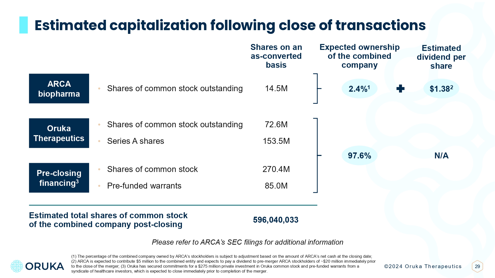 ©2024 Oruka Therapeutics 30 Please refer to ARCA’s SEC filings for additional information (1) The percentage of the combined company owned by ARCA’s stockholders is subject to adjustment based on the amount of ARCA’ s n et cash at the closing date; (2) ARCA is expected to contribute $5 million to the combined entity and expects to pay a dividend to pre - merger ARCA stockholde rs of ~$20 million immediately prior to the close of the merger; (3) Oruka has secured commitments for a $275 million private investment in Oruka common stock and pr e - funded warrants from a syndicate of healthcare investors, which is expected to close immediately prior to completion of the merger. Estimated total shares of common stock of the combined company post - closing • Shares of common stock • Pre - funded warrants 270.4M 85.0M 596,040,033 14.5M • Shares of common stock outstanding Expected ownership of the combined company Shares on an as - converted basis Estimated dividend per share ARCA biopharma • Shares of common stock outstanding • Series A shares 72.6M 153.5M Oruka Therapeutics Pre - closing financing 3 2.4% 1 97.6% N/A $1.38 2 Estimated capitalization following close of transactions